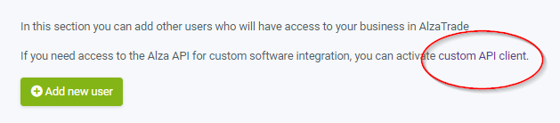To utilize API endpoints for order downloads, you must first request access to your own dedicated API client. You can set up your own API client after logging into the Alza Trade portal in the "Shop settings" tab - "User administration".