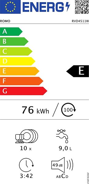Dishwasher narrow (45cm), freestanding and with panel, energy efficiency class D, place settings (ECO programme): 9×, noise emissions: C, cutlery basket, delayed start, dry autoopen, aqua stop, adjustable baskets, display, quick wash, audible washing cycle end signalisation and extrahygiene, height 85 cm, width 44.6 cm, depth 61.5 cm
