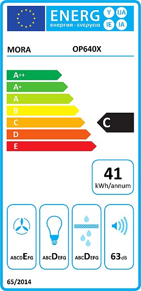 Extractor Hood chimney, energy class B, noise level: 63 dB, suction performance 608 m3/h, performance settings: 3, filter type: fat, upper outlet diameter: 15 cm, backflow valve, width: 60 cm