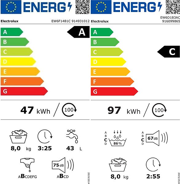 Washer Dryer Set –, dryer capacity 8 kg, weighted energy consumption of the washing machine 47 kWh/100 cycles, dryer's estimated annual energy consumption 177 kWh/annum, main functions of the washing machine delayed start, main functions of the dryer heat Pump, display and interior lighting