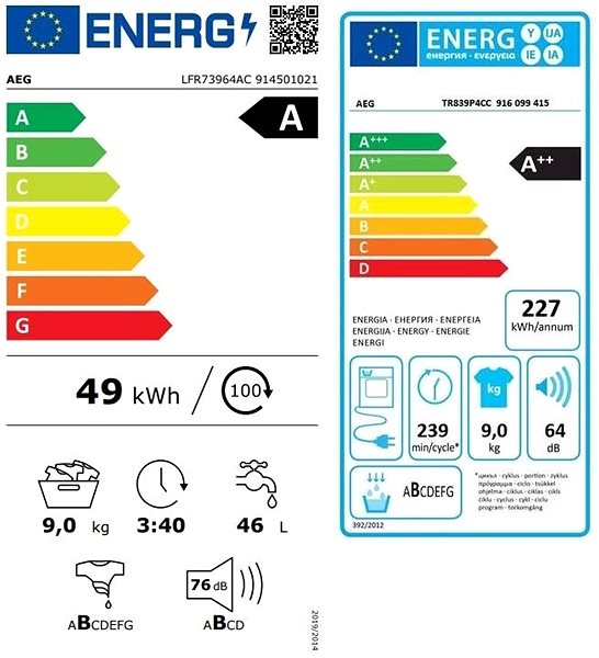 Washer Dryer Set – washing machine energy efficiency class A, dryer energy efficiency class A++, washing machine capacity (ECO program 40-60 °C) 9 kg, dryer capacity 9 kg, dryer's estimated annual energy consumption 227 kWh/annum, main functions of the washing machine steam programme, inverter motor, delayed start, fast programme, display and child protection, main functions of the dryer delayed start, heat Pump, display and interior lighting