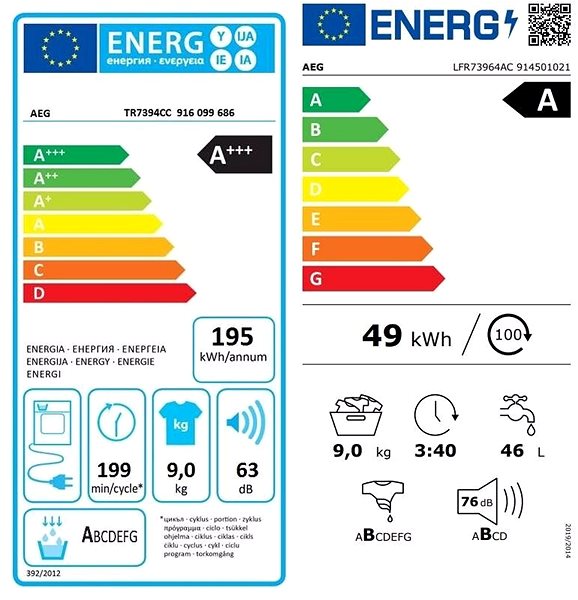 Washer Dryer Set – washing machine energy efficiency class A, dryer energy efficiency class A+++, washing machine capacity (ECO program 40-60 °C) 9 kg, dryer capacity 9 kg, dryer's estimated annual energy consumption 195 kWh/annum, main functions of the washing machine inverter motor, display, automatic Dosing, control via mobile phone and child protection, main functions of the dryer connection to waste, delayed start, display, anti-wrinkle system and control via mobile phone