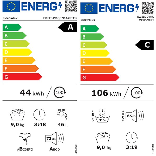 Washer Dryer Set – washing machine energy efficiency class A, dryer capacity 9 kg, weighted energy consumption of the washing machine 46 kWh/100 cycles, dryer's estimated annual energy consumption 194 kWh/annum, main functions of the washing machine steam programme, inverter motor, automatic weighing, fast programme and control via mobile phone, main functions of the dryer self-cleaning condenser