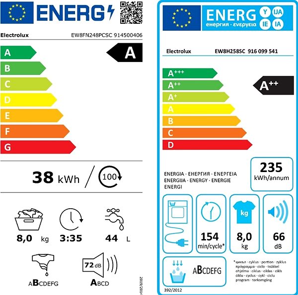 Washer Dryer Set – washing machine energy efficiency class A, dryer energy efficiency class A+++, washing machine capacity (ECO program 40-60 °C) 8 kg, dryer capacity 9 kg, weighted energy consumption of the washing machine 38 kWh/100 cycles, dryer's estimated annual energy consumption 194,10 kWh/annum, main functions of the washing machine inverter motor, delayed start, fast programme and display, main functions of the dryer interior lighting and control via mobile phone
