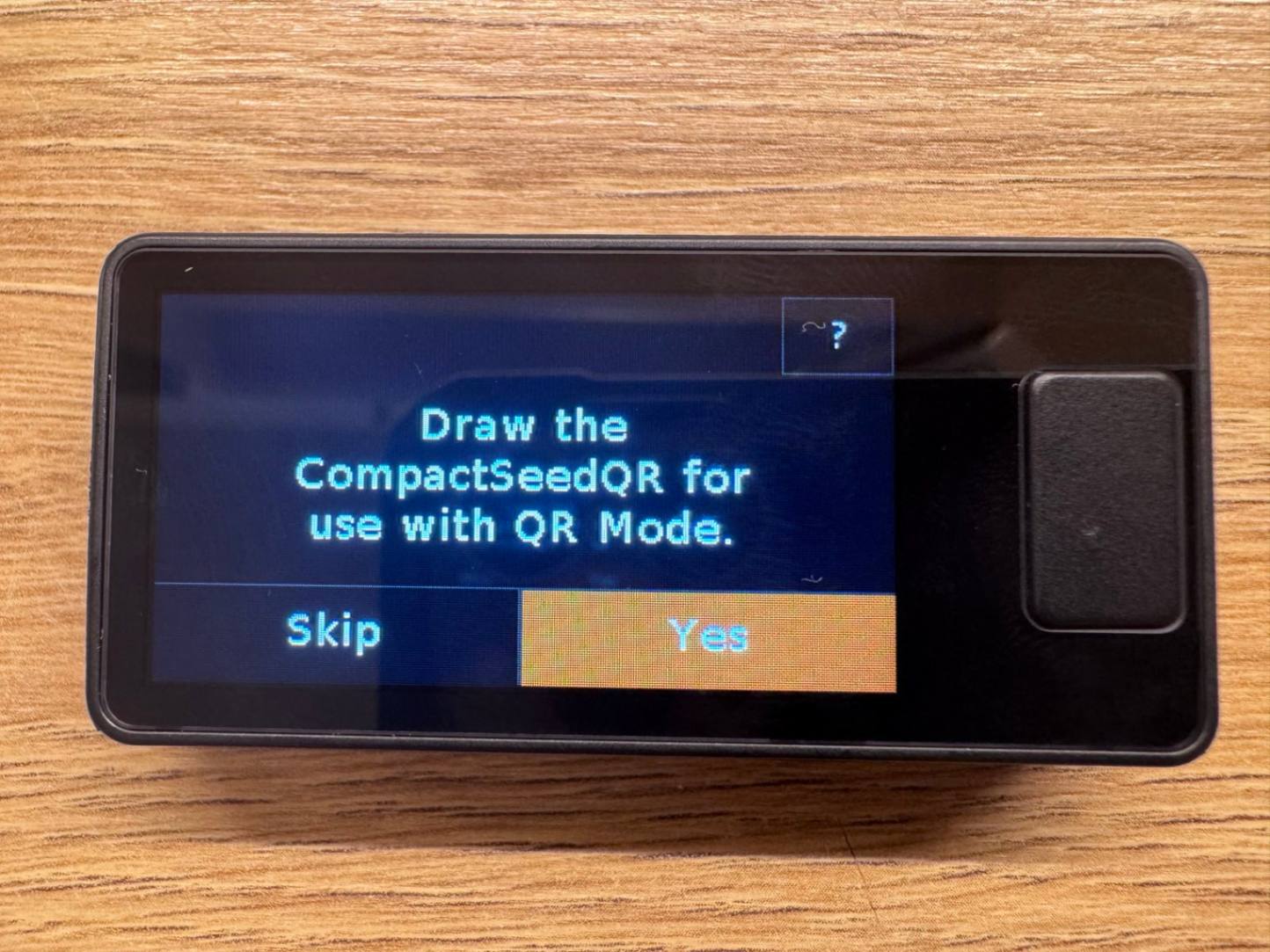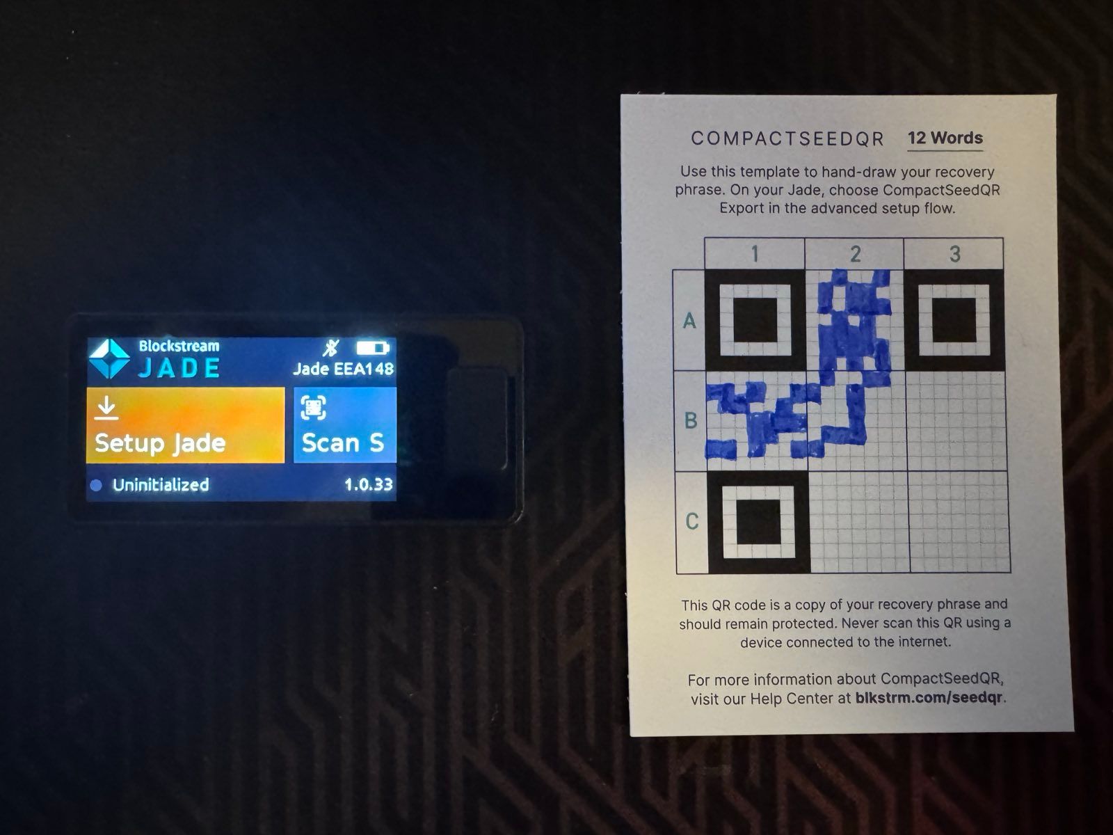 Kromě klasického zaznamenání obnovovací fráze (seed) pomocí slov podle standardu BIP39 umožňuje JADE PLUS i alternativu v podobě SeedQR. SeedQR představuje seed uložený ve formě QR kódu, který lze snadno načíst kamerou zařízení. Pokud zvolíte tuto možnost, platí stejná bezpečnostní pravidla jako u tradiční slovní zálohy – SeedQR nepořizujte v digitální podobě a bezpečně ho uchovejte, nejlépe gravírovaný do kovu. JADE PLUS nabízí vytvoření SeedQR ve formátu Compact SeedQR, který umožňuje uložit zálohu seedu v kompaktnější podobě. I zde platí, že citlivá data nelze číst bez použití kompatibilní peněženky.