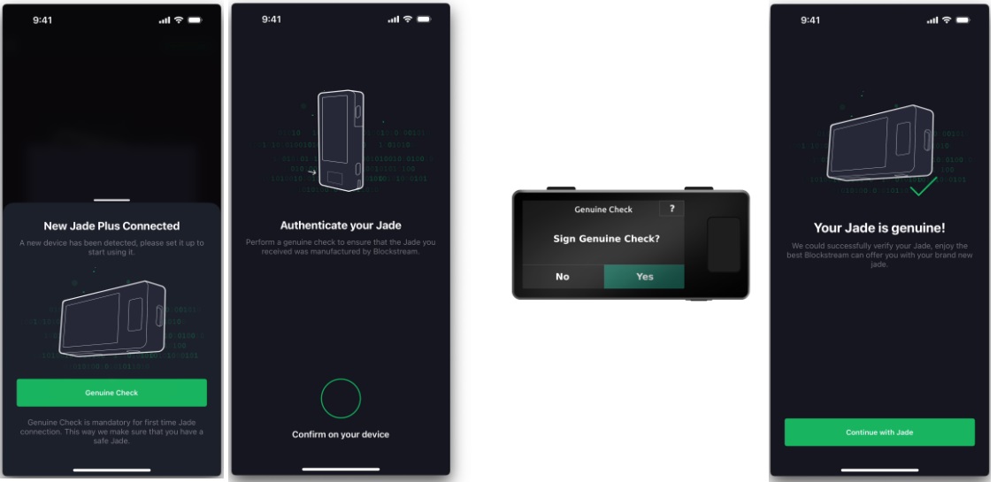 Každý kus peněženky JADE PLUS vyrobený společností Blockstream obsahuje unikátní soukromý klíč, který umožňuje ověřit jeho pravost. Tento klíč je bezpečně integrován již při výrobě zařízení a nikdy jej nelze exportovat nebo kopírovat. Po připojení peněženky k aplikaci Blockstream Green mohou uživatelé provést tzv. „Genuine Check“, tedy ověření, zda jejich zařízení skutečně pochází od společnosti Blockstream a nebylo vyrobeno či upraveno třetí stranou. Pokud je ověření úspěšné, uživatel má jistotu, že zařízení je autentické a bezpečné pro použití.